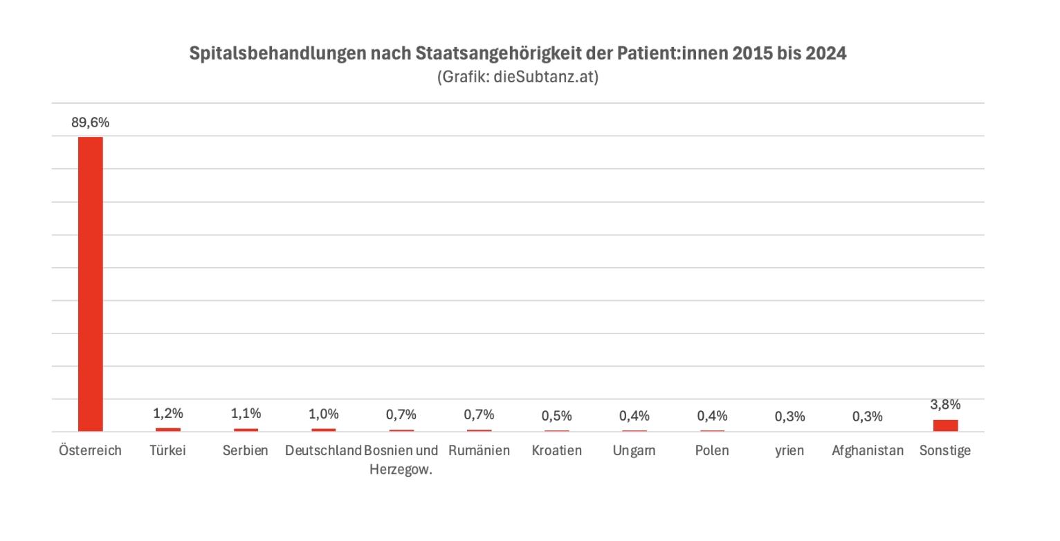 Im Jahr 2024 lag der Anteil der Behandlungen für nicht-österreichische Staatsangehörige bei 11,2 Prozent. Das sind etwas mehr als über die zehn Jahre – und doch relativ wenig: Der Anteil nicht-österreichischer Staatsangehöriger an der Gesamtgesellschaft war damals mit ziemlich genau 20 Prozent fast doppelt so hoch. Man könnte auch sagen: Ausländerinnen und Ausländer, die in der Regel ebenfalls Steuern zahlen, sind ganz offensichtlich sehr gesund. Das wäre jedoch zu einfach. Der Punkt ist eher, dass sie vergleichsweise jung sind und der Gesundheitszustand oft erst mit dem Alter nachlässt; dass eher erst mit dem Alter also Behandlungen notwendig werden.