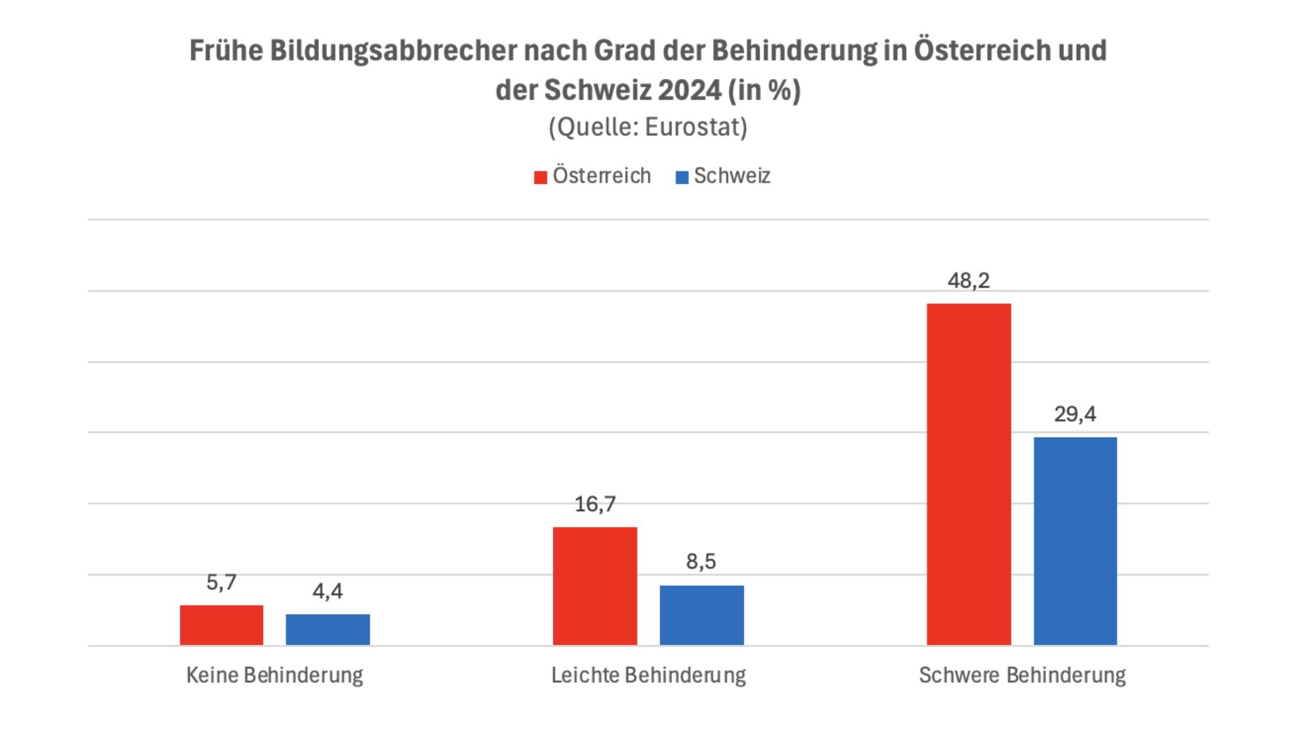 In Österreich geht man lieber in die andere Richtung. In Oberösterreich sollen neue Sonderschulen errichtet werden. Ob das wirklich sinnvoll ist? Eurostat hat gerade Daten veröffentlicht, die grundsätzlich zu denken geben könnten: Kinder und Jugendliche mit einer Behinderung werden hierzulande viel eher frühe Bildungsabbrecher als zum Beispiel in der Schweiz. Bei all jenen mit einer schweren Behinderung handle es sich in Österreich um 48,2 und in der Eidgenossenschaft um 29,4 Prozent. Bei Kindern mit einer leichten Behinderung ist die Wahrscheinlichkeit hierzulande mit 16,7 Prozent ziemlich genau doppelt so groß.