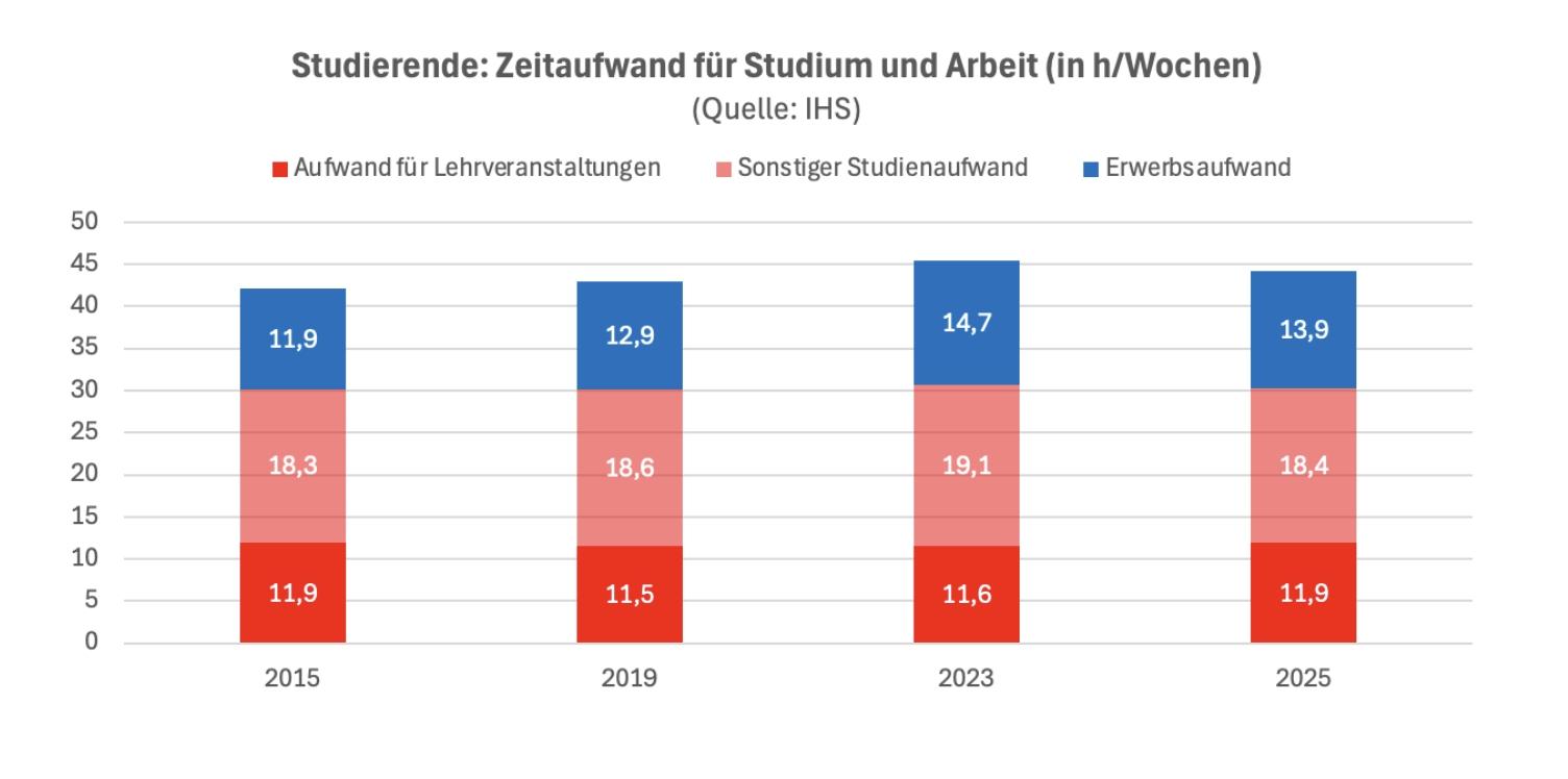 Das ist auch insofern beachtlich, als es ja noch die Uni gibt: Hier fallen laut IHS-Bericht im Schnitt 11,9 Stunden für die Teilnahme an Lehrveranstaltungen sowie 18,3 Stunden für sonstigen Studienaufwand, wie Lernen, an. In Summe ergibt das 44,2 Stunden.