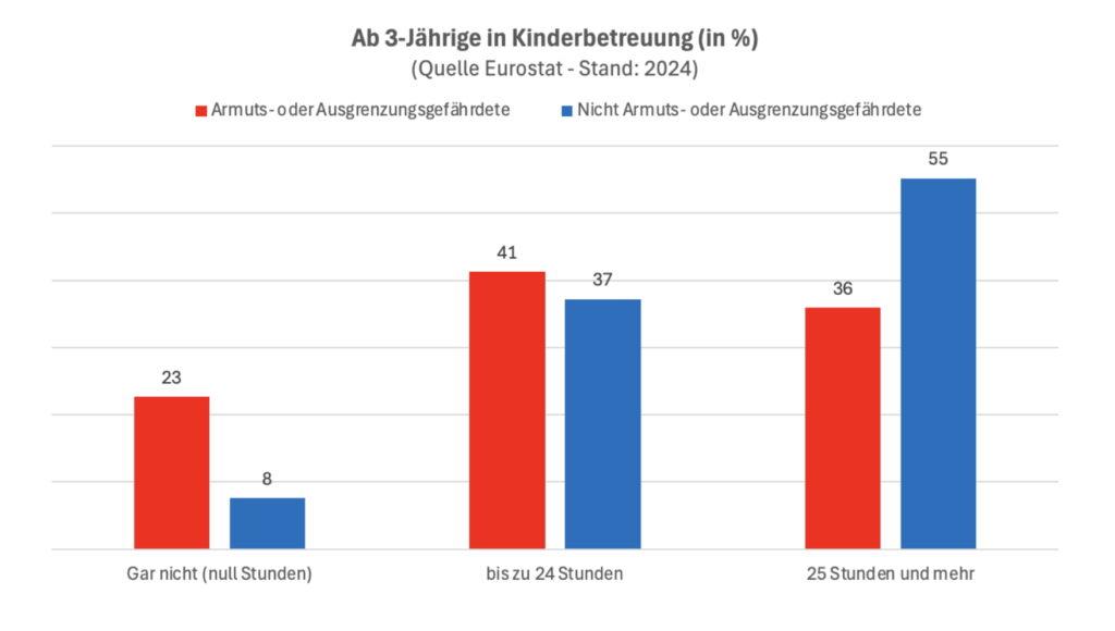 Außerdem: Wenn armuts- oder ausgrenzungsgefährdete Kinder ab 3 einen Kindergarten besuchen, dann eher nur bis zu 24 Stunden pro Woche. 25 Stunden und mehr tun es lediglich 36 Prozent, während es sich bei allen übrigen Kindern um mehr als die Hälfte handelt (55 Prozent).