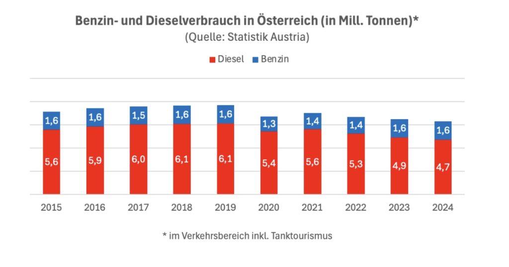 Das deckt sich in der Tendenz mit dem Spritverbrauch in Österreich. Allein im Verkehrsbereich belief sich dieser inklusive Tanktourismus Ende der 2010er Jahre auf bis zu 6,1 Millionen Tonnen Diesel und 1,6 Millionen Tonnen Benzin. 2024 handelte es sich um 4,7 bzw. 1,6 Millionen Tonnen, war also zumindest der Dieselverbrauch deutlich niedriger. (Die Angabe in Tonnen stammt von der Statistik Austria bzw. aus den Energiebilanzen, die diese führt.)