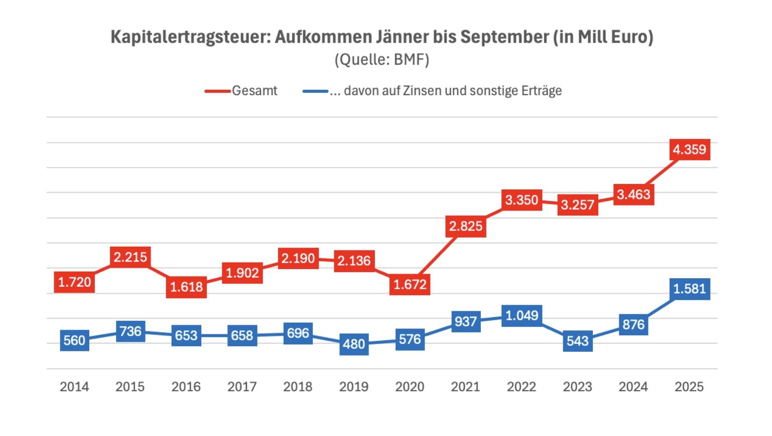 Finanzminister Markus Marterbauer (SPÖ) bzw. die Expertinnen und Experten seines Ressorts haben sich verschätzt: Für heuer haben sie ein geringeres Kapitalertragsteuer-Aufkommen erwartet als für das vergangenen Jahr. In den ersten neun Monaten ist es mit 4,4 Milliarden Euro jedoch um ein Viertel höher ausgefallen als im damaligen Vergleichszeitraum.