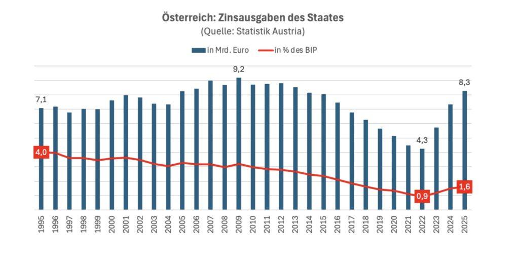 In den 1990er Jahren mögen die Zinsausgaben auch schon hoch gewesen sein und etwa jenen für Bildung entsprochen haben. Der Punkt ist jedoch, dass heute nicht nur sie stark zunehmen, sondern auch Ausgaben für Pensionen, Gesundheit und Pflege etwa.