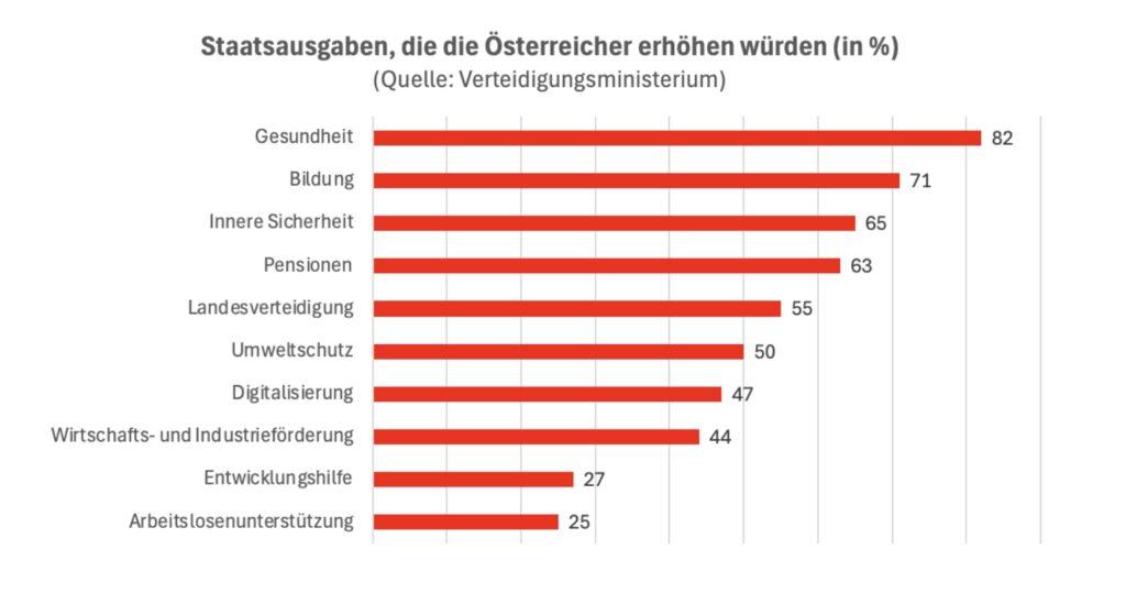 Aufgrund der Mehrheitsverhältnisse wird hier im Übrigen allein der Fokus auf den Anteil der Österreicher gelegt, die Erhöhungen fordern: In Bezug auf Gesundheit tun das ganze 82 Prozent, in Bezug auf Bildung 71 und innere Sicherheit 65 Prozent. Bei Pensionen handelt es sich um 63 Prozent sowie Landesverteidigung, wo wirklich große Erhöhungen vorgesehen sind in den kommenden Jahren, 55.