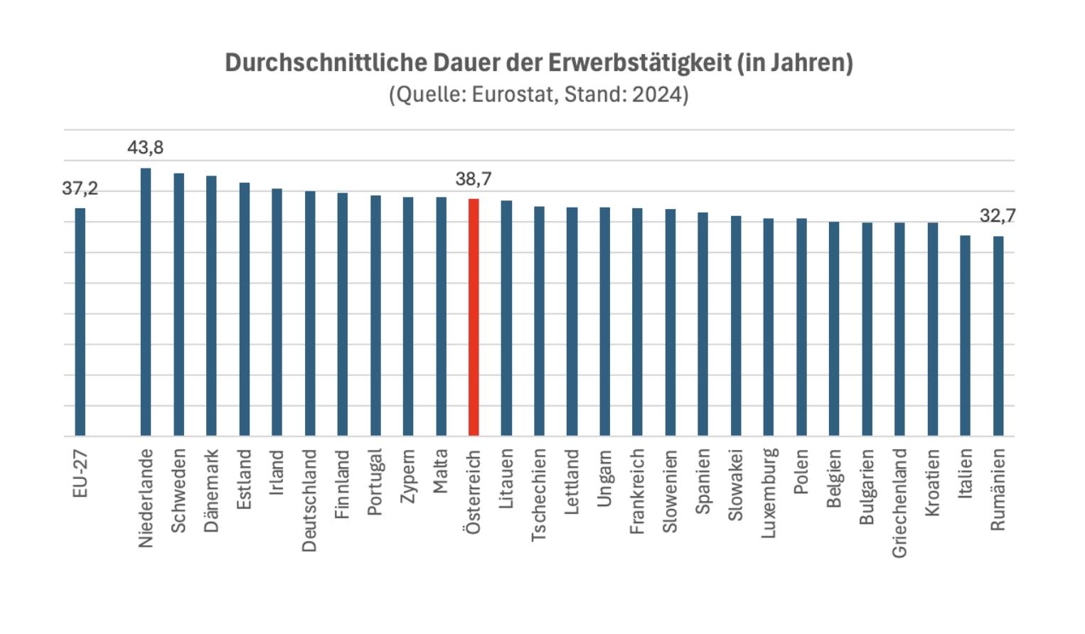 Im EU-Schnitt beträgt die Lebensarbeitszeit 37,2 Jahre. Die Unterschiede sind jedoch groß: In Deutschland, Irland, Dänemark, Schweden und den Niederlanden handelt es sich um 40 und mehr Jahre, in den Niederlanden mit 43,8 um die meisten. Das sind fünf mehr als in Österreich.