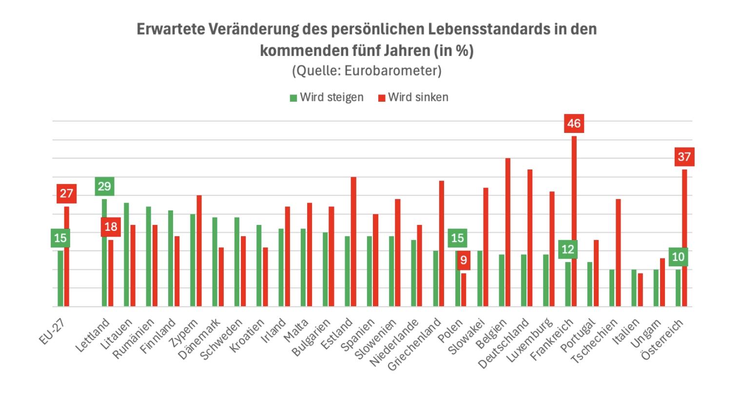 So wenige wie in Österreich sind es zwar auch in Tschechien, Italien und Ungarn (ebenfalls zehn Prozent), dort befürchten auf der anderen Seite aber nicht gar so viele eine Verschlechterung des Lebensstandards. Das tun hierzulande ganze 37 Prozent. Deutlich mehr sind es nur in Frankreich (46 Prozent). EU-weit handelt es sich um 27 Prozent.