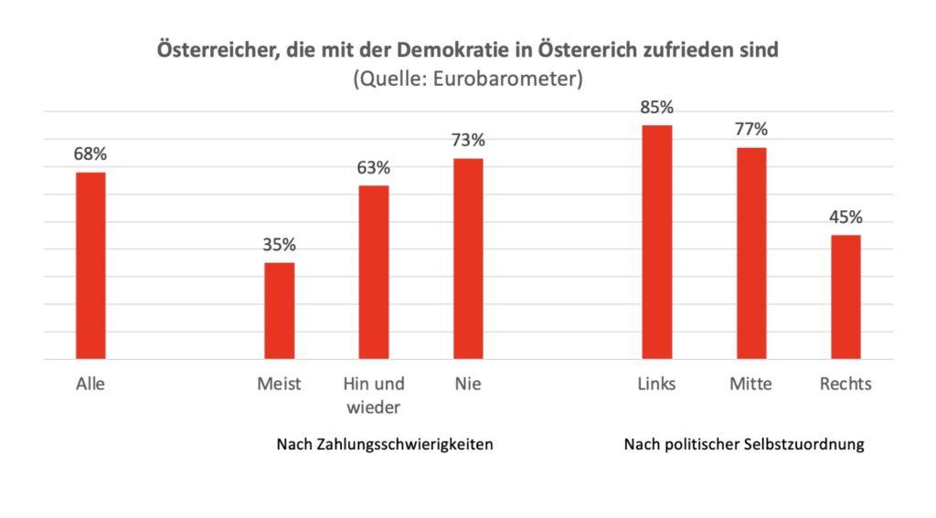 ZAHLEN ZUM TAG. Eine Mehrheit der Menschen, die meist Zahlungsschwierigkeiten haben oder sich selbst politisch rechts verorten, ist mit dem Funktionieren der Demokratie in Österreich nicht zufrieden.