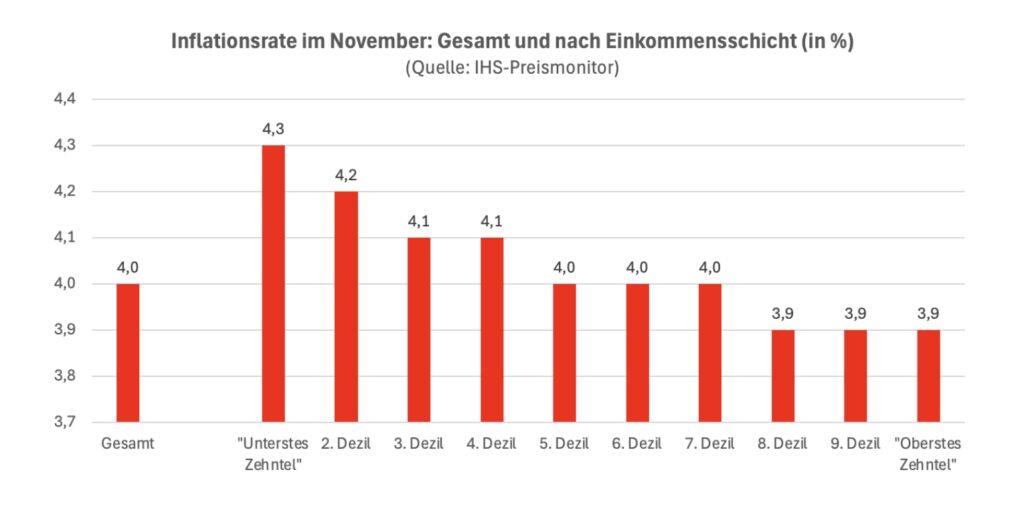 Was bei der Teuerung kaum beachtet wird, aber relevant ist, ist, dass sie besonders jenen zusetzt, die weniger Geld zur Verfügung haben. Beispiel: Im November belief sich die Inflationsrate auf vier Prozent. Für die obersten drei Zehntel der Einkommensbezieher war sie laut IHS-Preismonitor mit 3,9 Prozent jedoch etwas niedriger, für das unterste Zehntel mit 4,3 Prozent hingegen deutlich höher.