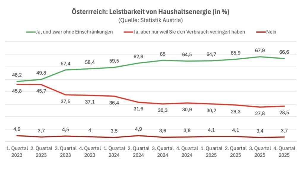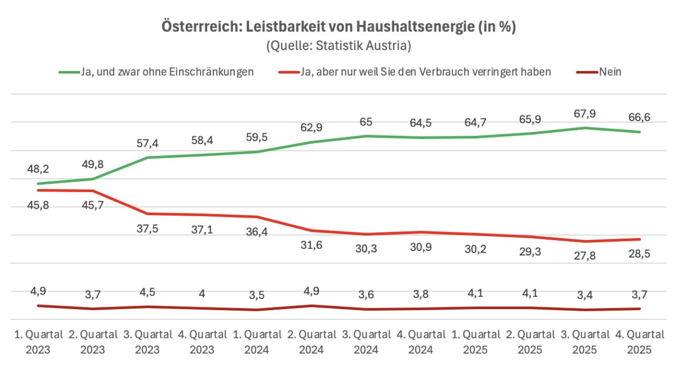 In Folge der Coronapandemie haben statistische Ämter europaweit begonnen, ein Mal pro Quartal durch Befragungen soziale Krisenfolgen zu messen. Seit Anfang 2023 auch in Bezug auf die Leistbarkeit von Haushaltsenergie. Die Entwicklung seither ist aufschlussreich.
