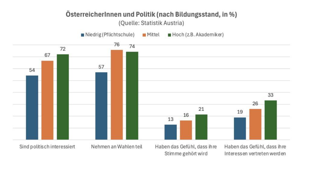 Auffallend ist, dass alle angeführten Werte bei Personen mit einem niedrigen Bildungsstand nach formalen Kriterien besonders niedrig sind: Bei all jenen, die nicht über die Pflichtschule hinausgekommen sind (laut Statistik Austria handelte es sich um gut eine Million), sind nur 54 Prozent politisch interessiert, nehmen nur 57 Prozent an Wahlen teil, haben nur 19 Prozent das Gefühl, dass ihre Interessen vertreten werden und gar nur 13 Prozent, das ihre Stimme gehört wird. Bei Männern und Frauen mit einem hohen Bildungsstand, also zum Beispiel Akademikern, sind diese Werte umgekehrt am höchsten.