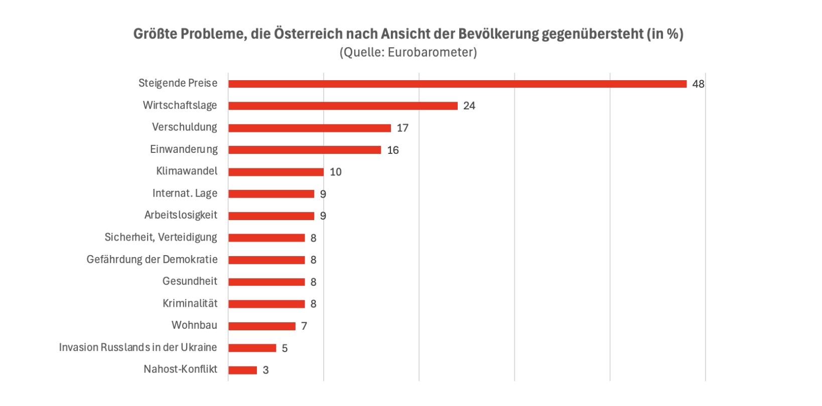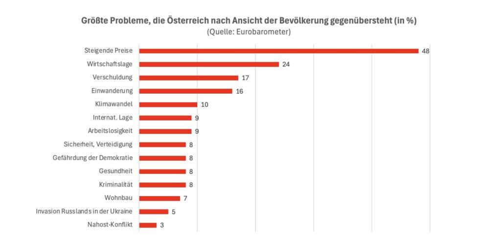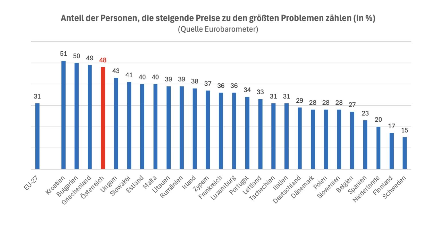 Österreich hat eine weit überdurchschnittliche Inflationsrate im europäischen Vergleich – und das wird von sehr vielen Menschen auch so wahrgenommen: Bei der Eurobarometer-Standarderhebung ist im vergangenen Herbst unter anderem die Frage gestellt worden, welche Probleme zu den größten gezählt werden auf nationaler Ebene. Bei vorgegebenen Themen waren zwei Nennungen möglich. Ergebnis: In Österreich zählen die mit Abstand meisten steigende Preise dazu. Mit 48 Prozent handelt es sich um so viele wie in kaum einem anderen EU-Land. EU-weit tun es „nur“ 31 Prozent.