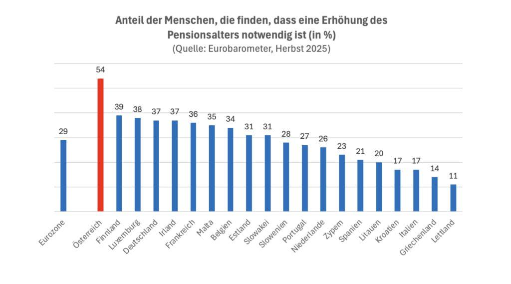 Dass zur nachhaltigen Absicherung des Systems eine Erhöhung des Pensionsalters notwendig ist, finden in allen Euro-Ländern weniger als 50 Prozent. Mit einer Ausnahme: In Österreich tun es 54 Prozent, also eine Mehrheit.