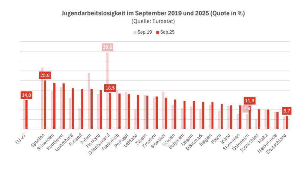 Vergleicht man die Jugendarbeitslosigkeit in Österreich im September 2025 mit jener im September 2019, also dem letzten Herbst vor den Krisenjahren, ergibt sich ein massiver Anstieg: Der Anteil all jener unter 25-Jährigen, die sich nicht mehr in einer Ausbildung befinden, aber ohne Job sind, hat um die Hälfte bzw. von 7,9 au 11,9 Prozent zugenommen.