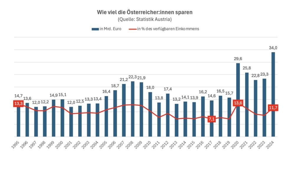 Schaut man sich an, wie viel die österreichischen Haushalte seit 1995 gespart haben, deckt sich der Verlauf mit der wirtschaftlichen Entwicklung. In Krisenjahren legten sie mehr, in guten Jahren weniger auf die Seite.