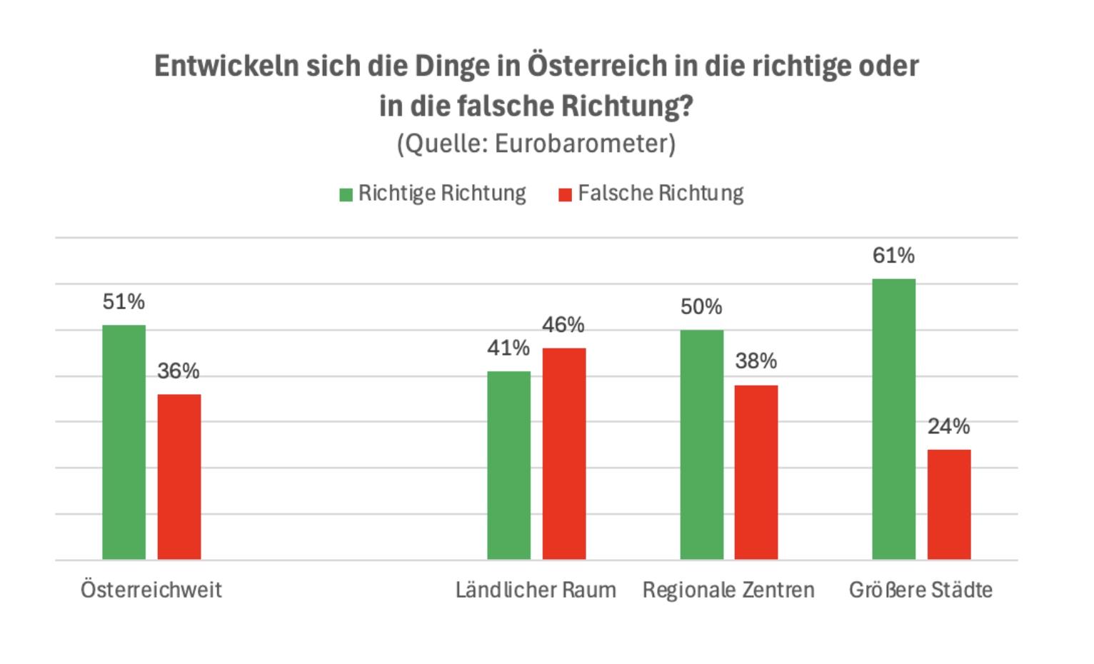Und es geht weiter über die Fragestellung, wie die Entwicklung der Dinge in Österreich alles in allem eingeschätzt wird: In ländlichen Regionen findet eine relative Mehrheit von 46 Prozent, in die falsche. In Städten tun das mit 24 Prozent nur etwa halb so viele. Dort ist eine absolute Mehrheit von 61 Prozent der Überzeugung, dass es in die richtige Richtung geht.