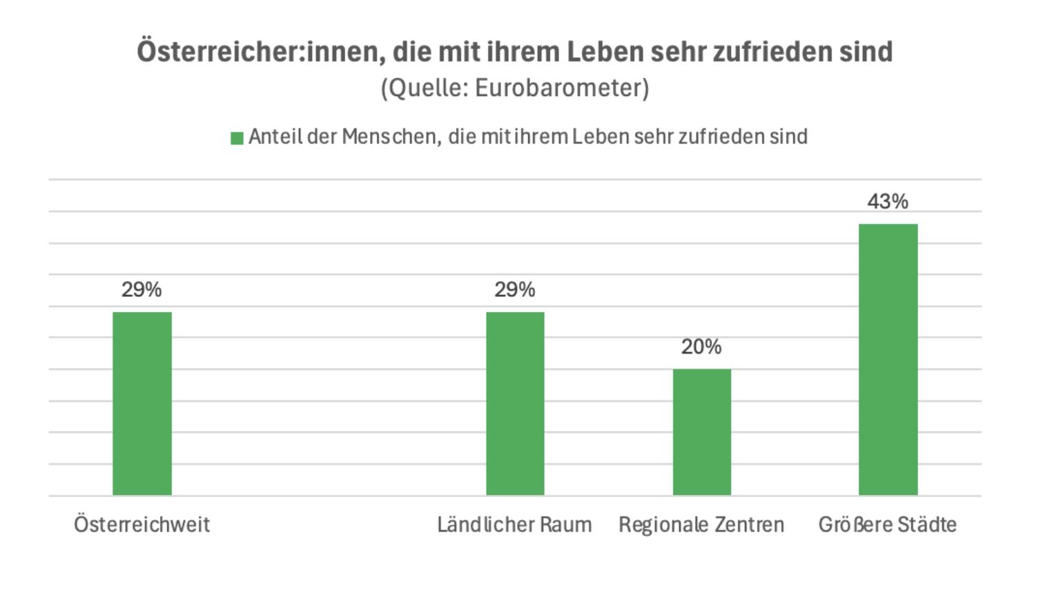 Das zeigen Ergebnisse einer Eurobarometer-Befragung, die im September veröffentlicht worden sind. Genauer: Detailergebnisse nach Wohnort. Hier gibt es enorme Unterschiede: Es fängt damit an, dass im ländlichen Raum mit 29 Prozent deutlich weniger Männer und Frauen angeben, mit ihrem Leben sehr zufrieden zu sein als in größeren Städten (43 Prozent).