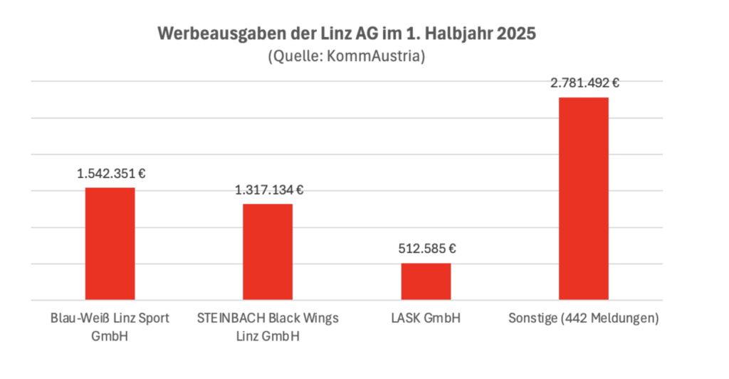 Das mag überraschen. Wirft man einen Blick auf die insgesamt 445 Meldungen, die sie gemacht hat, wird der Grund jedoch klar: Hier geht es um Werbung in einem sehr weiten Sinne. Gut ein Viertel der Summe (1,54 Millionen Euro) ging an die „Blau-Weiß Linz Sport GmbH“, die hinter dem gleichnamigen Fußballverein steht. Kaum weniger (1,32 Millionen) floss an die „Steinbach Black Wings Linz GmbH“ (Eishockey) und etwas mehr als eine halbe Million an die „LASK GmbH“ (Fußball).