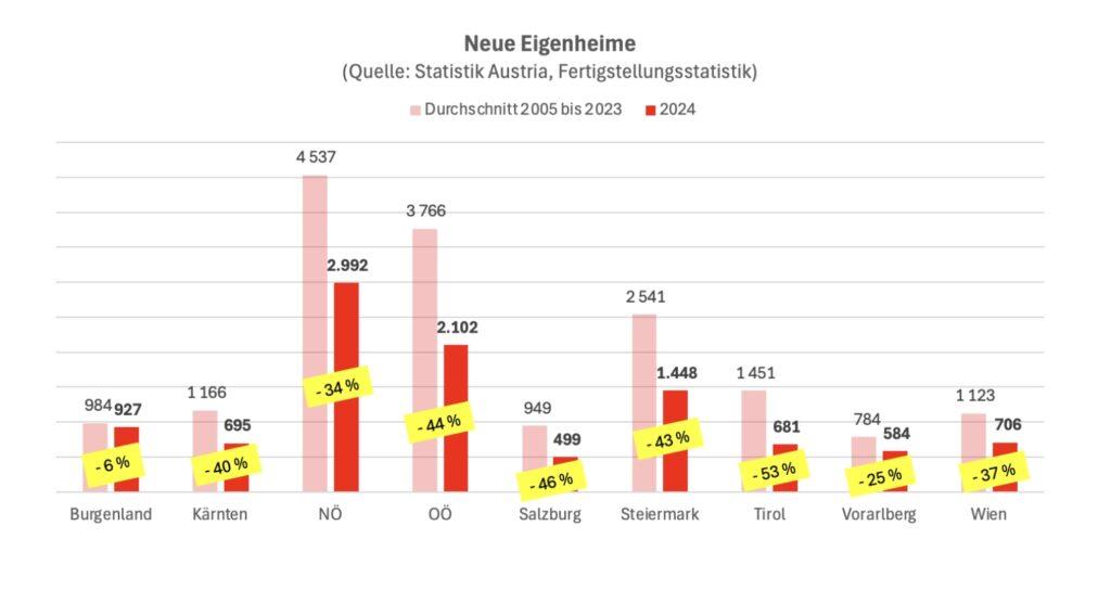 Nach Bundesländern gibt es in der Entwicklung extreme Unterschiede: Prozentuell am stärksten eingebrochen ist die Zahl fertiggestellter Eigenheime bzw. neuer Gebäude mit einer oder zwei Wohnungen in Tirol mit 53 Prozent. In Oberösterreich handelte es sich zwar „nur“ um ein Minus von 44 und in Niederösterreich gar „nur“ um ein solches von 34 Prozent, das entspricht dort aber über 1500 Häusern weniger.