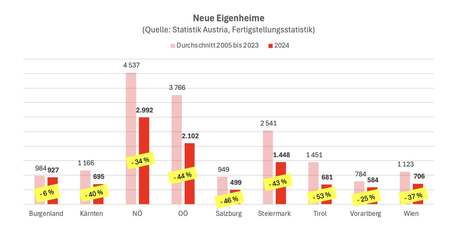 Nach Bundesländern gibt es in der Entwicklung extreme Unterschiede: Prozentuell am stärksten eingebrochen ist die Zahl fertiggestellter Eigenheime bzw. neuer Gebäude mit einer oder zwei Wohnungen in Tirol mit 53 Prozent. In Oberösterreich handelte es sich zwar „nur“ um ein Minus von 44 und in Niederösterreich gar „nur“ um ein solches von 34 Prozent, das entspricht dort aber über 1500 Häusern weniger.