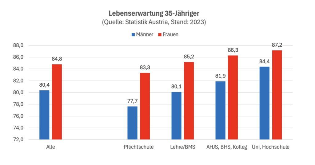 Wo Martin Winkler einen Punkt hat, ist in Bezug auf die unterschiedliche Lebenserwartung. Statistik Austria hat wieder einmal gemeldet, dass sie bei – nach formalen Kriterien – höher Gebildeten höher sei. Bei heute 35-jährigen Frauen mit Uni-Abschluss liegt sie (mit 84,4 Jahren) beispielsweise um fast sieben Jahre über jener von gleichaltrigen Frauen, die nicht über die Pflichtschule hinausgekommen sind (77,7 Jahre).