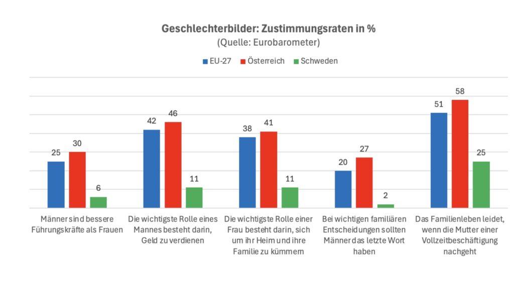 Das erweckt den Eindruck, dass so gut wie kein Unterschied mehr gemacht wird. In Wirklichkeit dürfte das in Österreich jedoch überdurchschnittlich stark der Fall sein im europäischen Vergleich und viel mehr als zum Beispiel in Schweden. Darauf lässt eine eigene Erhebung zu Geschlechterbildern schließen, die im Rahmen eines Eurobarometers im vergangenen Jahr durchgeführt worden ist. Pro Land gab es 1000 Befragte.