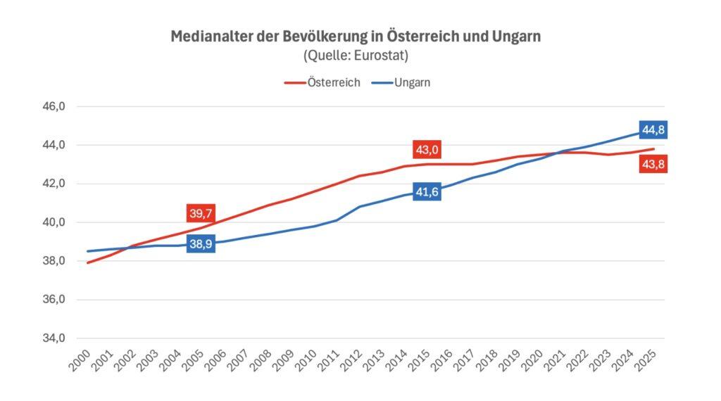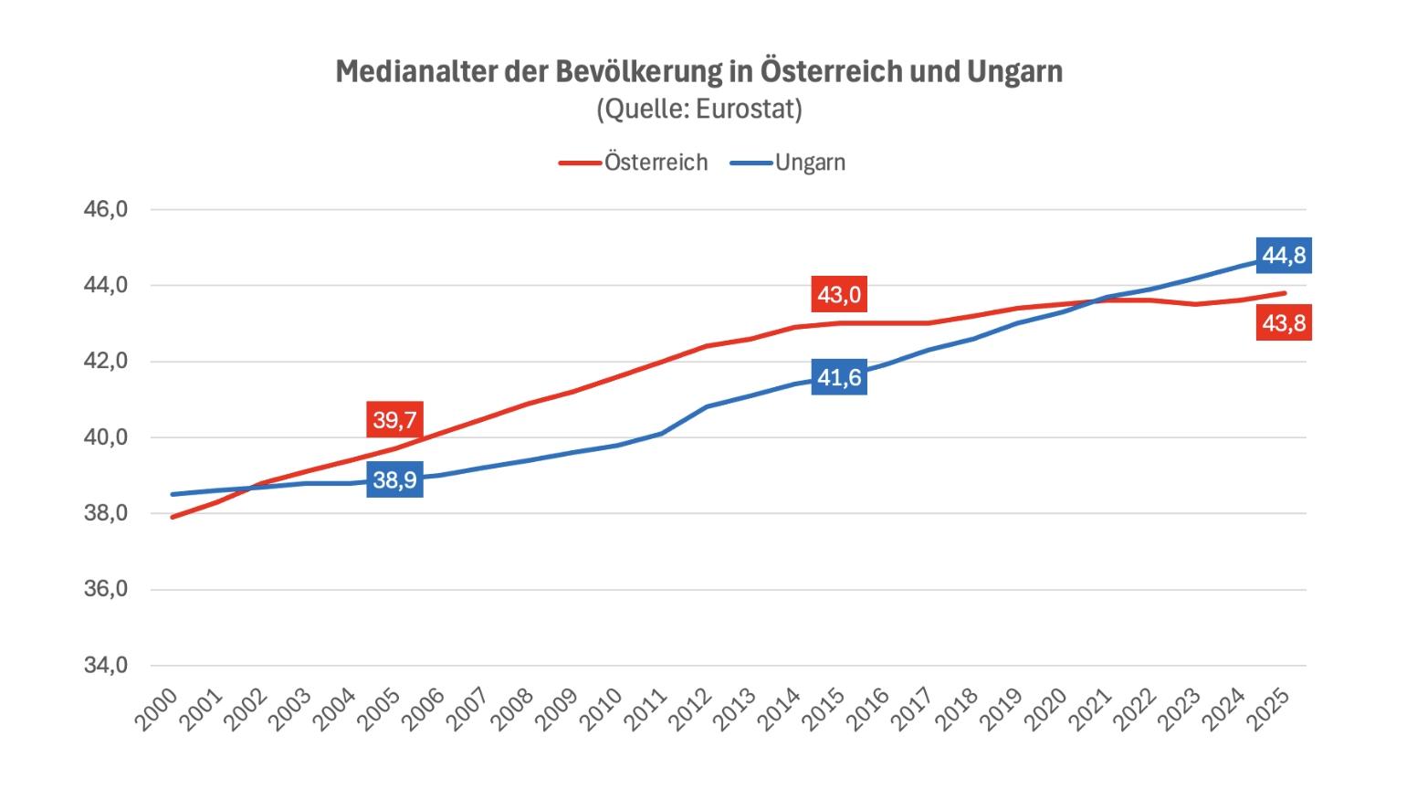 Eine Folge davon ist eine besonders stark alternde Bevölkerung: In Ungarn ist das Medianalter seit 2005 um knapp sechs und seit 2015 um etwas mehr als drei Jahre auf 44,8 gestiegen. Median bedeutet, dass 50 Prozent der Menschen jünger und 50 Prozent älter sind.