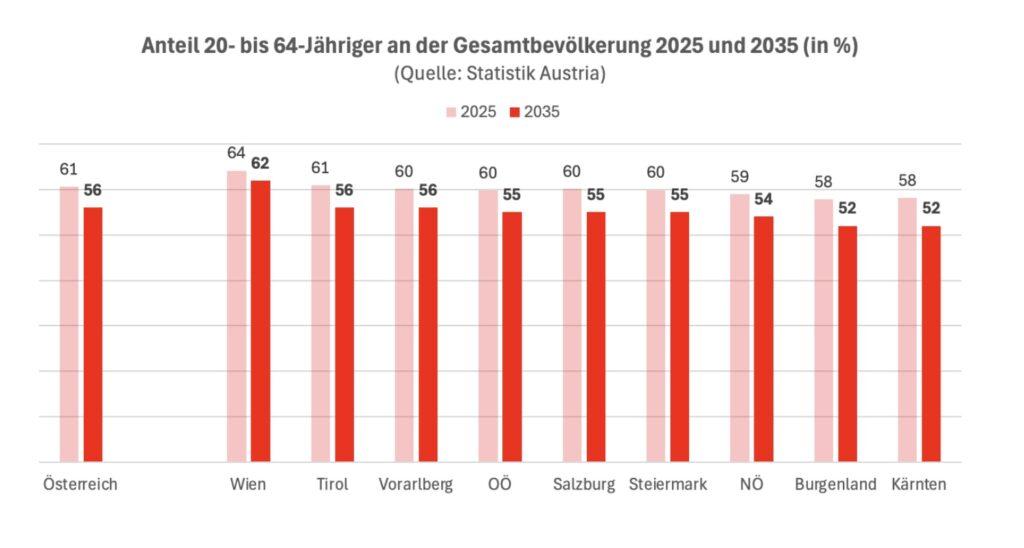 Im Übrigen gibt es nach Bundesländern ein gewisses West-Ost-Gefälle. Vergleichsweise jung ist die Bevölkerung auch in Tirol und in Vorarlberg. Vergleichsweise alt hingegen im Burgenland und in Kärnten. Sind dort heute noch 58 Prozent 20 bis 64 Jahre alt, so wird es sich in zehn Jahren mit 52 Prozent nur noch um gut die Hälfte handeln.