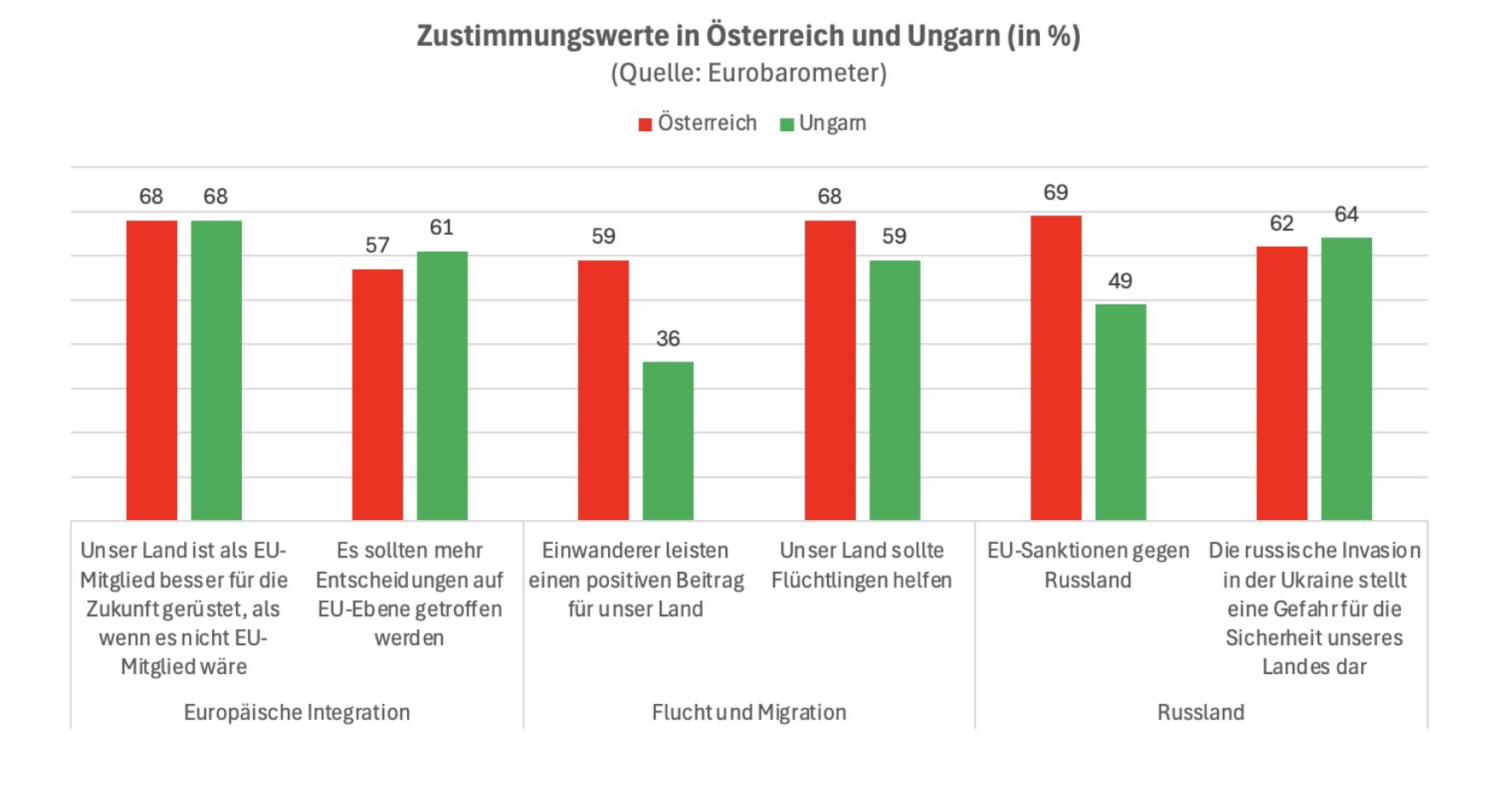 Beispiel europäische Integration: Laut Eurobarometer-Standardbefragung von Ende 2025 finden sowohl in Österreich als auch in Ungarn 68 Prozent der Menschen, dass das eigene Land als EU-Mitglied besser für die Zukunft gerüstet ist, als wenn es nicht der Union angehören würde. Außerdem sind in Österreich 57 und in Ungarn sogar 61 Prozent der Meinung, dass mehr Entscheidungen auf der EU-Ebene getroffen werden sollten.