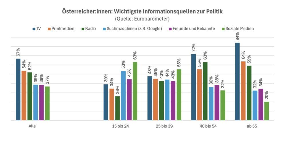 Zwei Drittel der Österreicherinnen und Österreicher geben auf die Frage, wo sie sich zu politischen Fragestellungen informieren, „TV“ an, gefolgt von Printmedien (54) und Radio (52 Prozent). Dabei kann es sich um herkömmliche, aber auch digitale Angebote dieser Medien handeln. Das hat eine Eurobarometer-Erhebung ergeben, an der hierzulande 1020 Männer und Frauen teilgenommen haben und die im Oktober veröffentlicht worden ist.