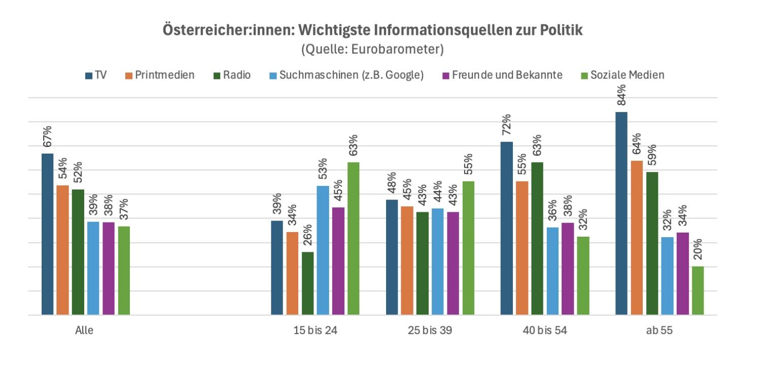 Zwei Drittel der Österreicherinnen und Österreicher geben auf die Frage, wo sie sich zu politischen Fragestellungen informieren, „TV“ an, gefolgt von Printmedien (54) und Radio (52 Prozent). Dabei kann es sich um herkömmliche, aber auch digitale Angebote dieser Medien handeln. Das hat eine Eurobarometer-Erhebung ergeben, an der hierzulande 1020 Männer und Frauen teilgenommen haben und die im Oktober veröffentlicht worden ist.