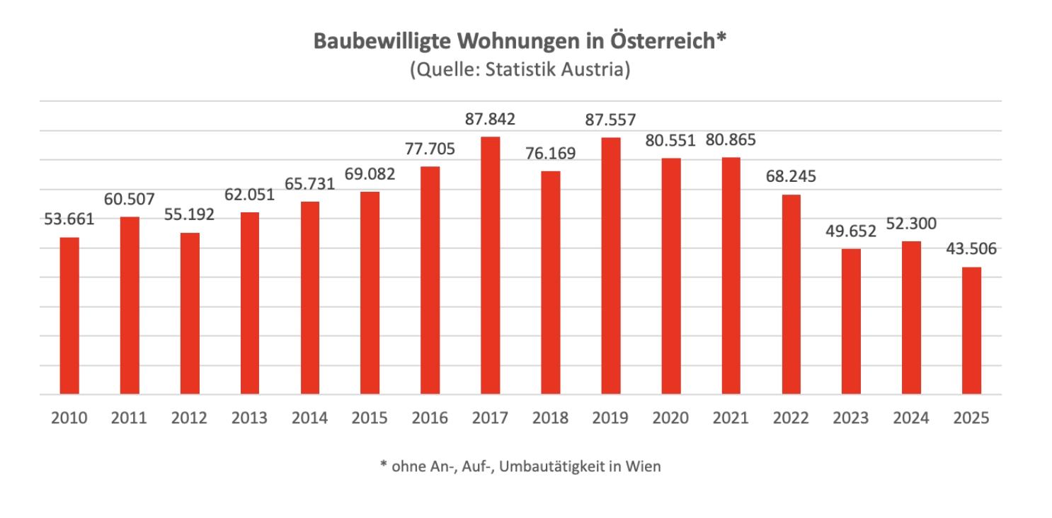 Diese Frage drängt sich zunehmend auf: Seit drei, vier Jahren gibt es bei der Wohnbautätigkeiten einen massiven Einbruch, werden immer weniger Projekte zur Bewilligung eingereicht. Im vergangenen Jahr handelt es sich österreichweit nur noch um 43.506 Wohnen. Das waren halb so viele wie in den Spitzenjahren 2017 und 2019 so wenige wie sieht vielen Jahren nicht mehr (siehe Grafik).