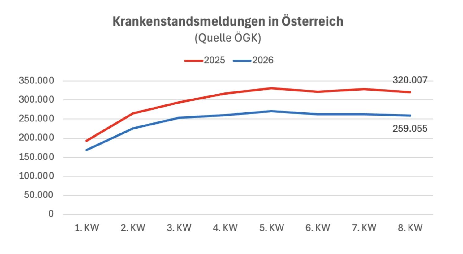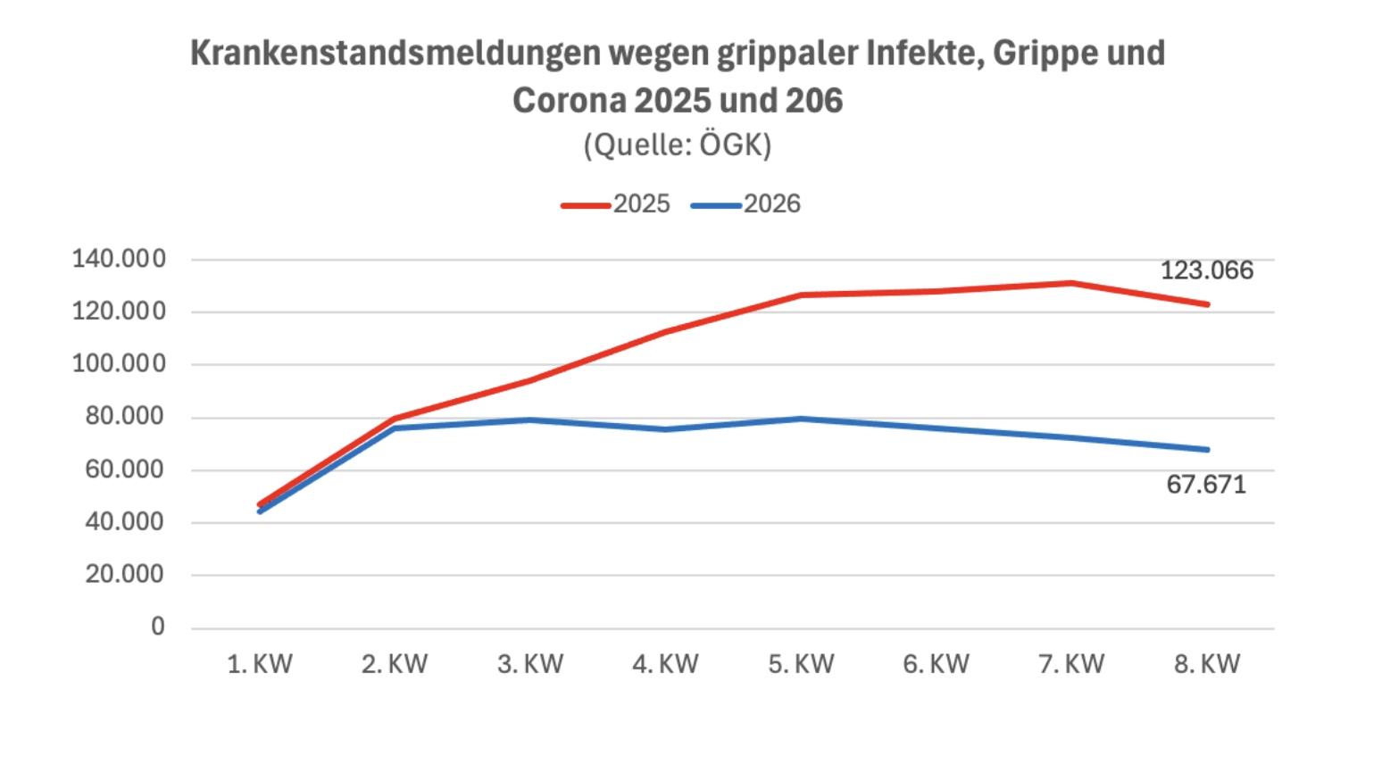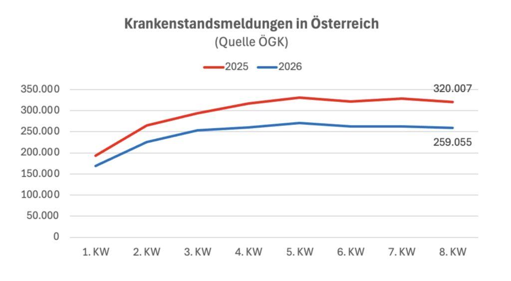 In der achten Kalenderwoche gab es heuer insgesamt 67.671 Meldungen wegen grippaler Infekte, Grippe und Corona. 2025 hatte es sich um 123.066 gehandelt. Mehr als die Hälfte der Meldungen insgesamt entfallen auf andere Gründe, die in den wöchentlichen Veröffentlichungen nicht ausgewiesen werden.