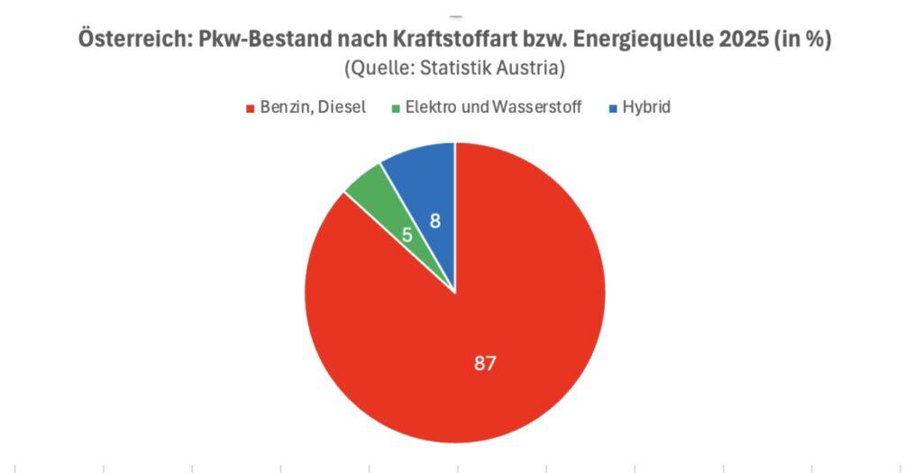 Bei acht Prozent handelt es sich um Hybrid- und bei nur fünf Prozent um Elektro- oder Wasserstofffahrzeuge. Der Umstieg auf sie verläuft schleppend. Bei zwar steigender Tendenz entfielen 2025 noch immer nur 21 Prozent aller Neuzulassungen auf Elektroautos.