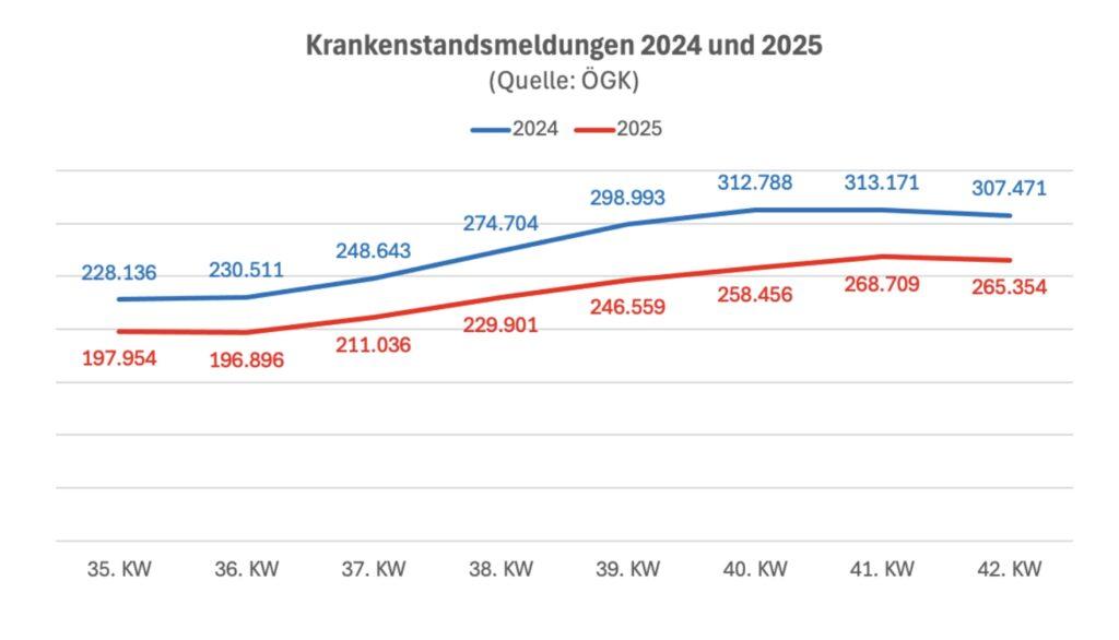 In der 42. Kalenderwoche bzw. von 13. bis 19. Oktober 2025 hat die Österreichische Gesundheitskasse zum Beispiel 265.354 Meldungen erfasst. 2024 hatte es sich um 307.461 gehandelt.