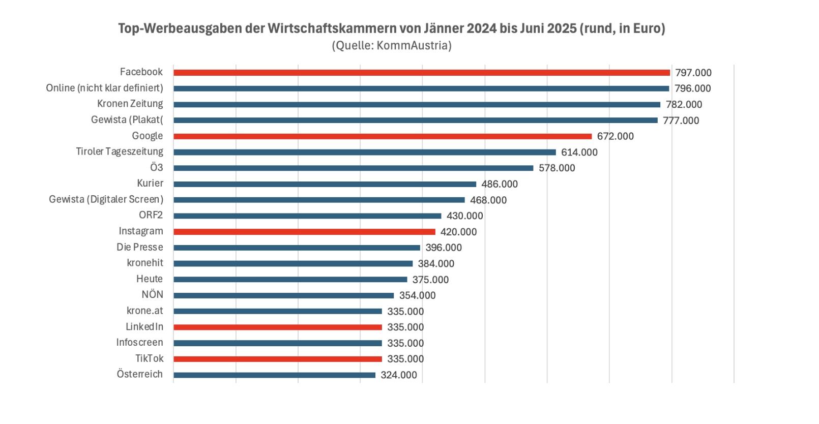 Bemerkenswert ist, wer von den Werbeausgaben der Wirtschaftskammern profitiert: Vor allem nicht-österreichische soziale Medien. Das mag einerseits nachvollziehbar sein, wenn es darum geht, Leute dort zu erreichen, wo sie sind. Es bedeutet andererseits aber, dass ausgerechnet von der Wirtschaftskammer auf den (Medienwirtschafts-)Standort gepfiffen wird.