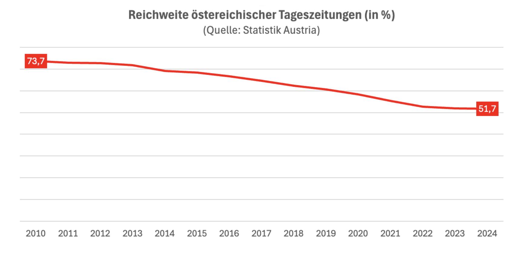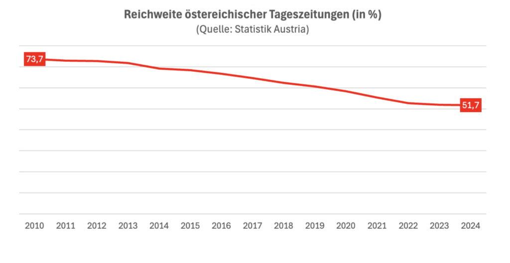 Tageszeitungen stecken nun in erheblichen Schwierigkeiten. Zwei Grafiken sollen dies verdeutlichen. Zunächst zur Reichweite: Die Zeitungen werden von immer weniger Menschen gelesen. Ob Online oder Print. Seit 2010 ist die Reichweite von drei Viertel auf die Hälfte gesunken. Gemeint ist der Anteil der ab 14-Jährigen.