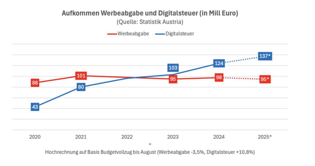 Parallel dazu schießt das Aufkommen der Digitalsteuer in die Höhe, die ebenfalls fünf Prozent beträgt und der Onlinewerbung unterliegt. 2023 betrug das Aufkommen 103 Millionen Euro, heuer geht es Richtung 140 Millionen Euro. Allein in den ersten acht Monaten dieses Jahres belief sich das Plus gegenüber dem Vorjahr auf mehr als zehn Prozent. Problem: Diese Werbung läuft vor allem auf Plattformen wie Google und Facebook.