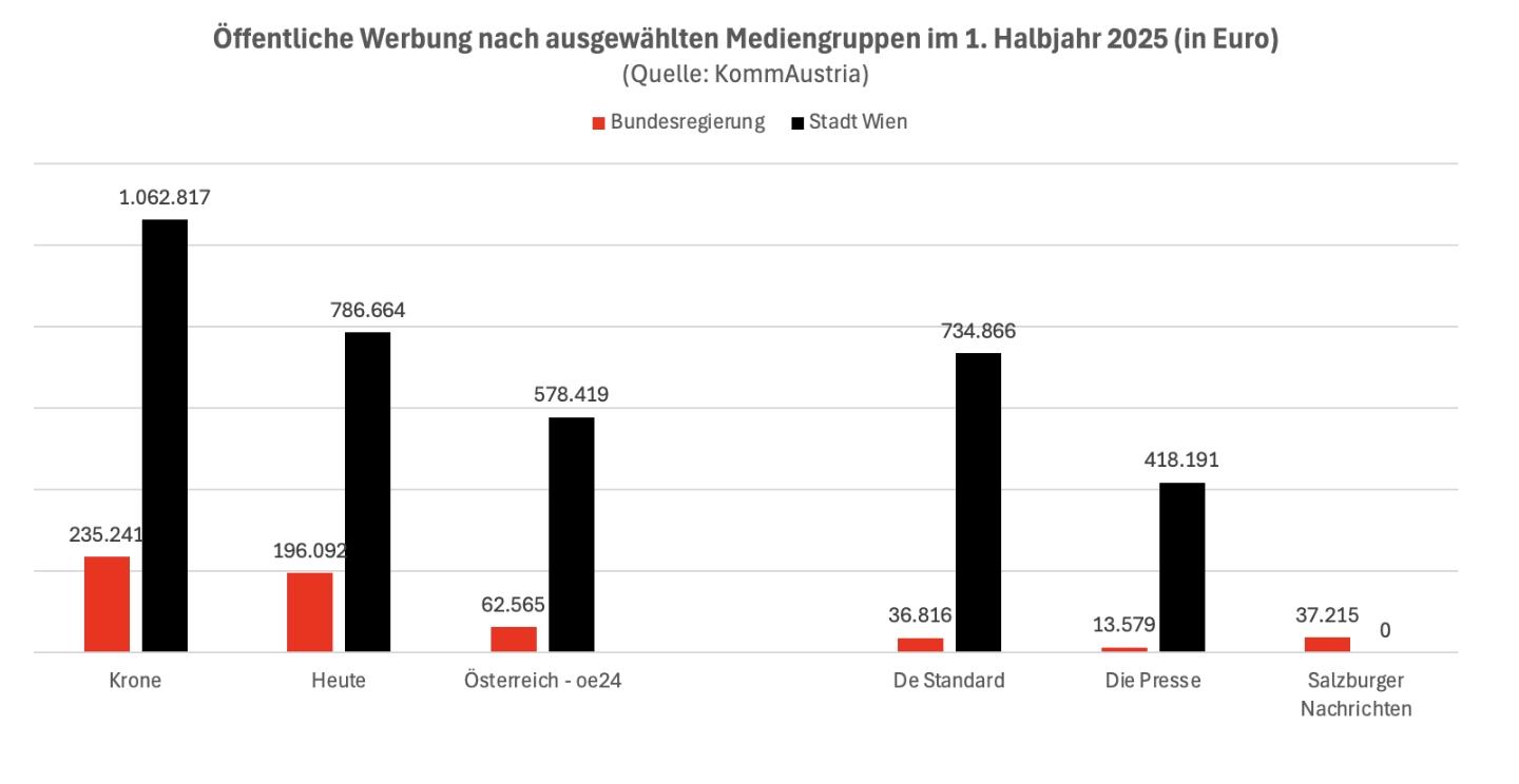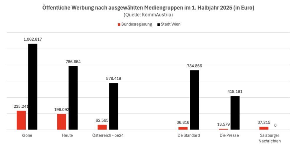 Die Stadt Wien hat bei Werbung im Vergleich zum Vorjahr keine Kürzungen vorgenommen. Bei ihr ist die Krone-Gruppe im ersten Halbjahr auf mehr als eine Million Euro gekommen, Heute auf eine Dreiviertel-Million und Österreich auf 578.000 Euro – was in diesem Fall weniger ist als die Standard-Gruppe (735.000 Euro).