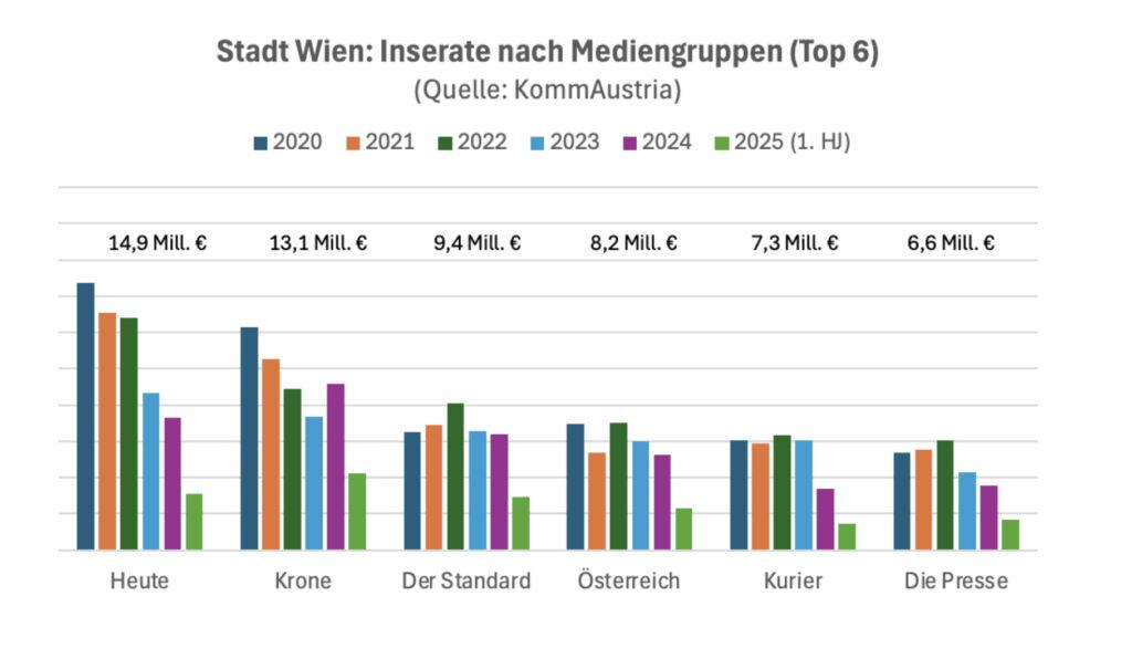 127,2 Millionen Euro hat die Stadt Wien von Anfang 2020 bis Mitte 2025 laut „KommAustria“-Datenbank für Werbung ausgegeben. Fast die Hälfte davon (59,5 Millionen) ging an nur sechs Verlagsgruppen. Allen voran AHV mit der Gratiszeitung Heute und dem Onlineportal heute.at. An sie allein flossen 14,9 Millionen Euro und damit sogar mehr als an die Krone-Gruppe (13,1 Millionen).