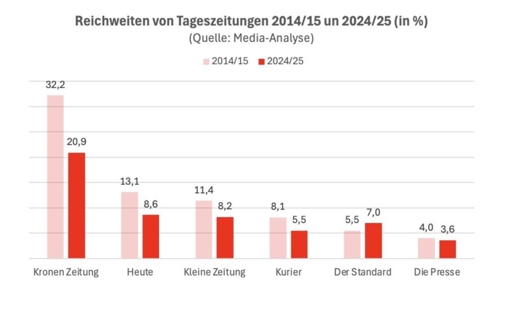 Sie ist relativ stark geblieben: Verloren haben nämlich auch fast alle anderen Zeitungen. Es gibt sonst keine mehr, bei der die Reichweite in Prozent auch nur zweistellig ist: „Heute“ folgt mit einem Riesenabstand bzw. 8,6 Prozent, die „Kleine“ kommt auf 8,2 und der „Standard“ auf sieben Prozent. Allein er konnte damit sogar zulegen und den „Kurier“ (5,5 Prozent) überholen.