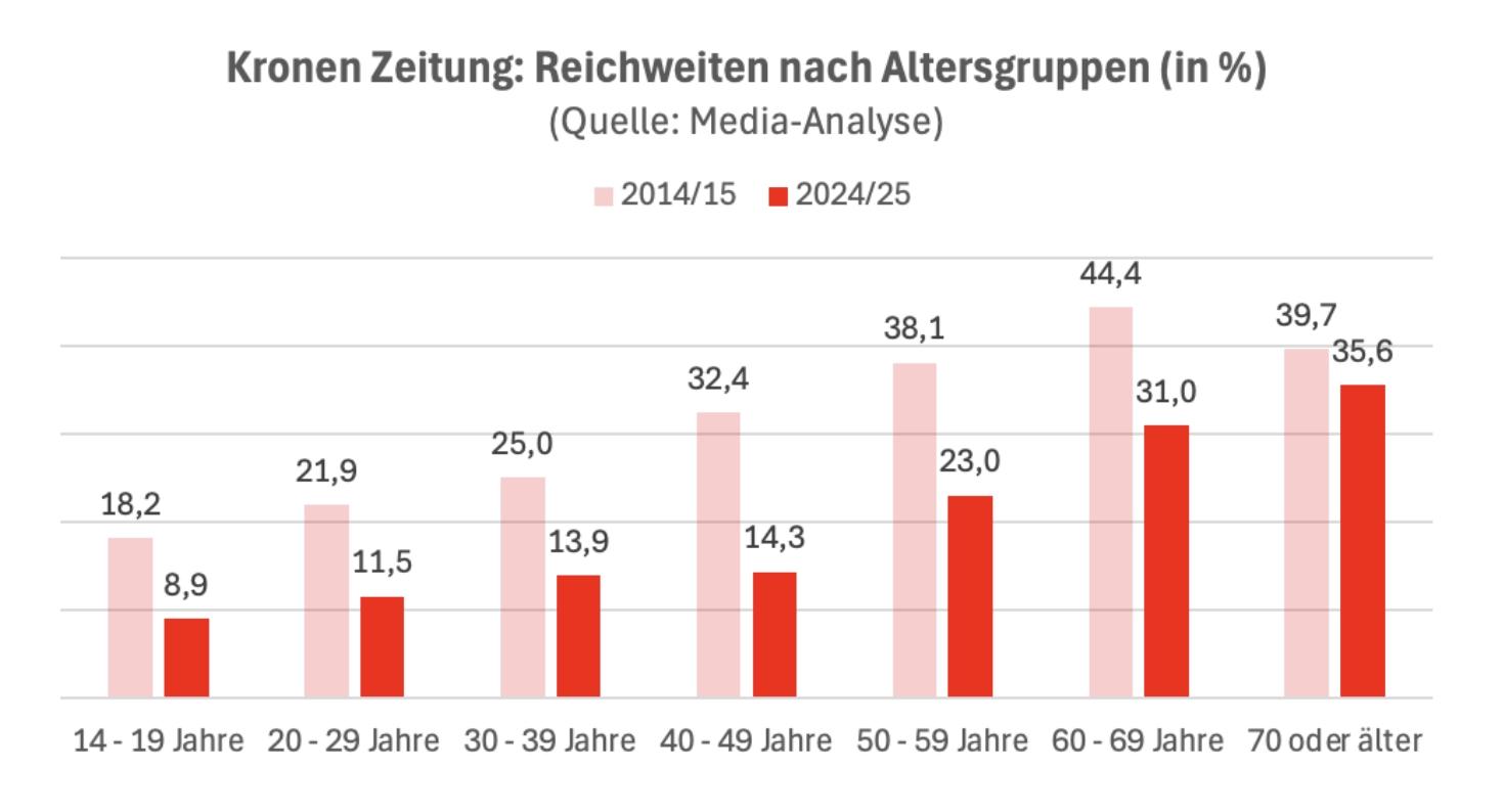 Ist die Reichweite der „Krone“ insgesamt um gut ein Drittel gesunken, so hat sie sich bei unter 60-Jährigen halbiert. Bei 14- bis 19-Jährigen etwa von 18,2 auf 8,9 Prozent. Auf der anderen Seite ist sie bei ab 70-Jährigen nur von 38,7 auf 35,6 Prozent zurückgegangen.