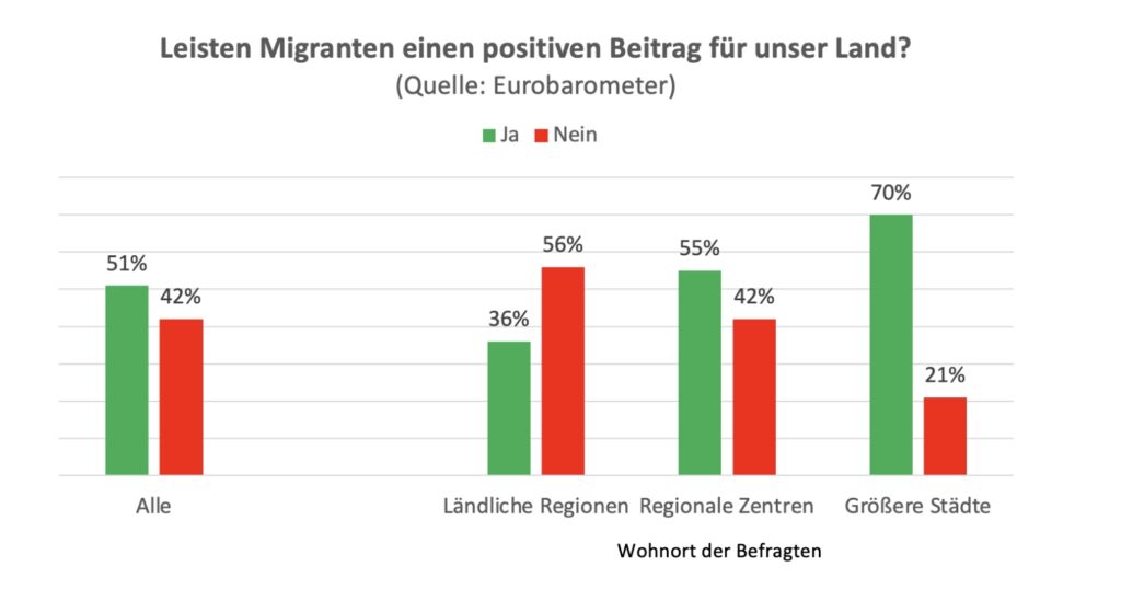Wesentlich erscheint außerdem, ob jemand überhaupt ein Zusammenleben erfährt im Alltag. „Foresight“-Erhebungen deuten darauf hin, dass das bei weitem nicht die Regel ist. Unter anderem dürfte das damit zu tun haben, dass die meisten Migranten und Flüchtlinge in Städten im Allgemeinen und Wien im Besonderen leben.