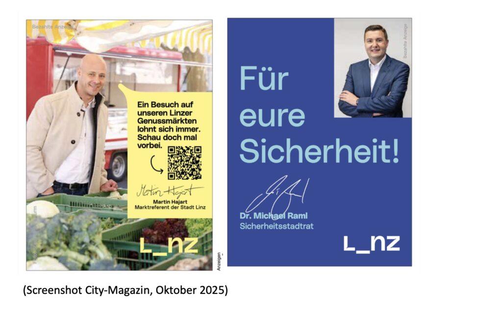 Nebenbei wirbt auch die FPÖ in dem Heft, und über die Stadt Linz wird durch Inserate Persönlichkeitskult betrieben, wie er auf Bundes- und Landesebene verboten ist: Hier sind Amtsträger abgebildet. Siehe Screenshots: „Für eure Sicherheit!“, teilt Sicherheitsstadtrat Michael Raml mit. Mehr nicht; neben einem Bild von ihm und auf blauem Grund. Er ist FPÖ-Mann. Sein ÖVP-Kollege, Vizebürgermeister Martin Hajart wiederum ließ sich als Marktreferent bei einem Gemüsestand fotografieren, um Bürgerinnen und Bürgen auf ihre Kosten genau dies mitzuteilen: „Ein Besuch auf unseren Linzer Genussmärkten lohnt sich immer. Schau doch mal vorbei.“