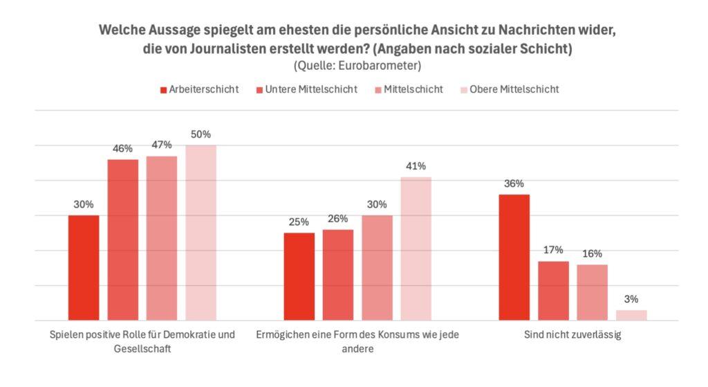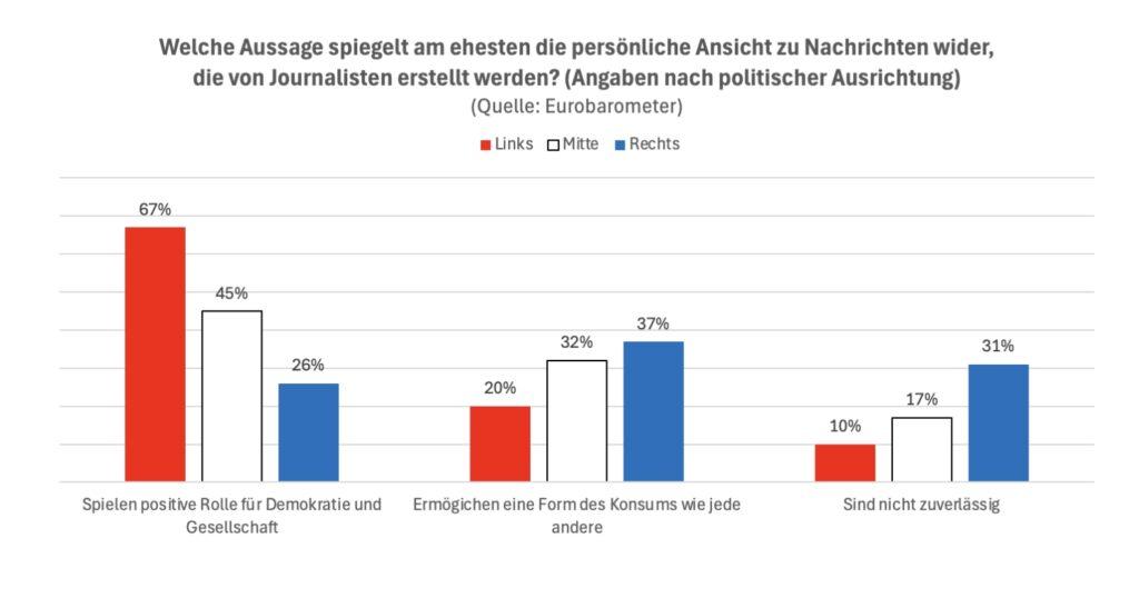 Gerade einmal 26 Prozent sind der Meinung, dass Nachrichten, die von Journalisten erstellt werden, eine „positive Rolle für Demokratie und Gesellschaft“ spielen. Viel mehr – nämlich 37 Prozent – sehen ein gewöhnliches Konsumgut oder – 31 Prozent – keine zuverlässige Informationsquelle. Zum Vergleich: Bei „Linken“ (ebenfalls gut ein Viertel der Gesellschaft) tun das nur zehn Prozent, orten immerhin 67 Prozent eine „positive Rolle für Demokratie und Gesellschaft“ – also zweieinhalb Mal mehr.