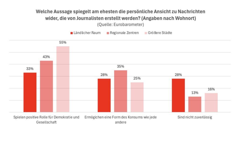 Zur Frage, wer sich rechts verortet und Medien nicht (mehr) traut, sind auf Basis der Erhebungsergebnisse lediglich Annäherungen möglich. Relativ viele von ihnen leben demnach in ländlichen Regionen Österreichs. Dort ist Journalismus für besonders viele Menschen nicht zuverlässig und hat für relativ wenige eine positive Rolle.