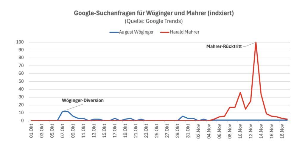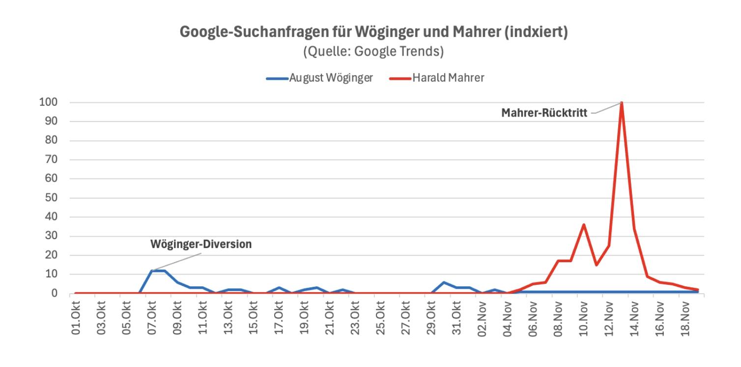 Ergebnis: Der Fall Mahrer erreichte ungleich größere Aufmerksamkeit als der Fall Wöginger. Das zeigt eine Auswertung von Google-Suchanfragen. Beim Mahrer-Rücktritt gab es fast zehn Mal mehr als bei der Wöginger-Diversion Anfang Oktober.