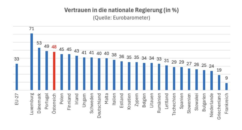 Mehr Vertrauen genießen nur die Regierungen von drei der insgesamt 27 Mitgliedstaaten der EU: Jene von Luxemburg (71), Dänemark (53) und Portugal (49 Prozent). Die ungarische von Viktor Orban muss sich mit 41 Prozent begnügen, die deutsche mit 40, die italienische mit 38 und die – abgeschlagen auf dem letzten Platz liegende – französische mit neun Prozent.