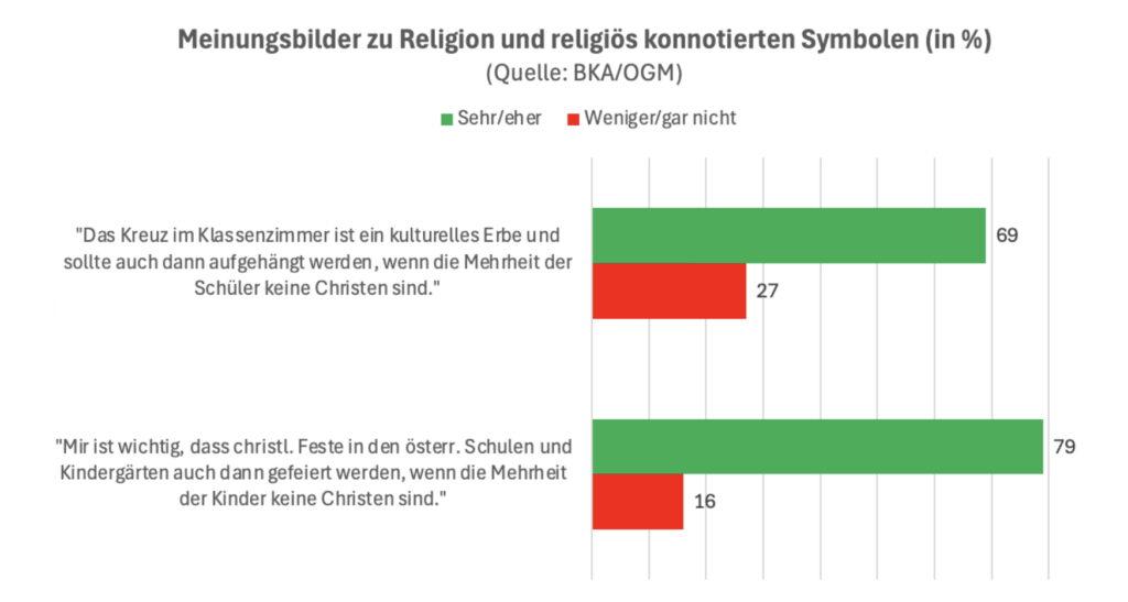 Feststellung B: „Mir ist wichtig, dass christliche Feste in den österreichischen Schulen und Kindergärten auch dann gefeiert werden, wenn die Mehrheit der Kinder keine Christen sind.“ Dem stimmten 69 Prozent zu. Plakolm dazu: „Das steht für den kulturellen Zusammenhang, das kulturelle Erbe und für die kulturelle Tradition, die auch in Zukunft ihren Platz bei uns in Österreich braucht.“