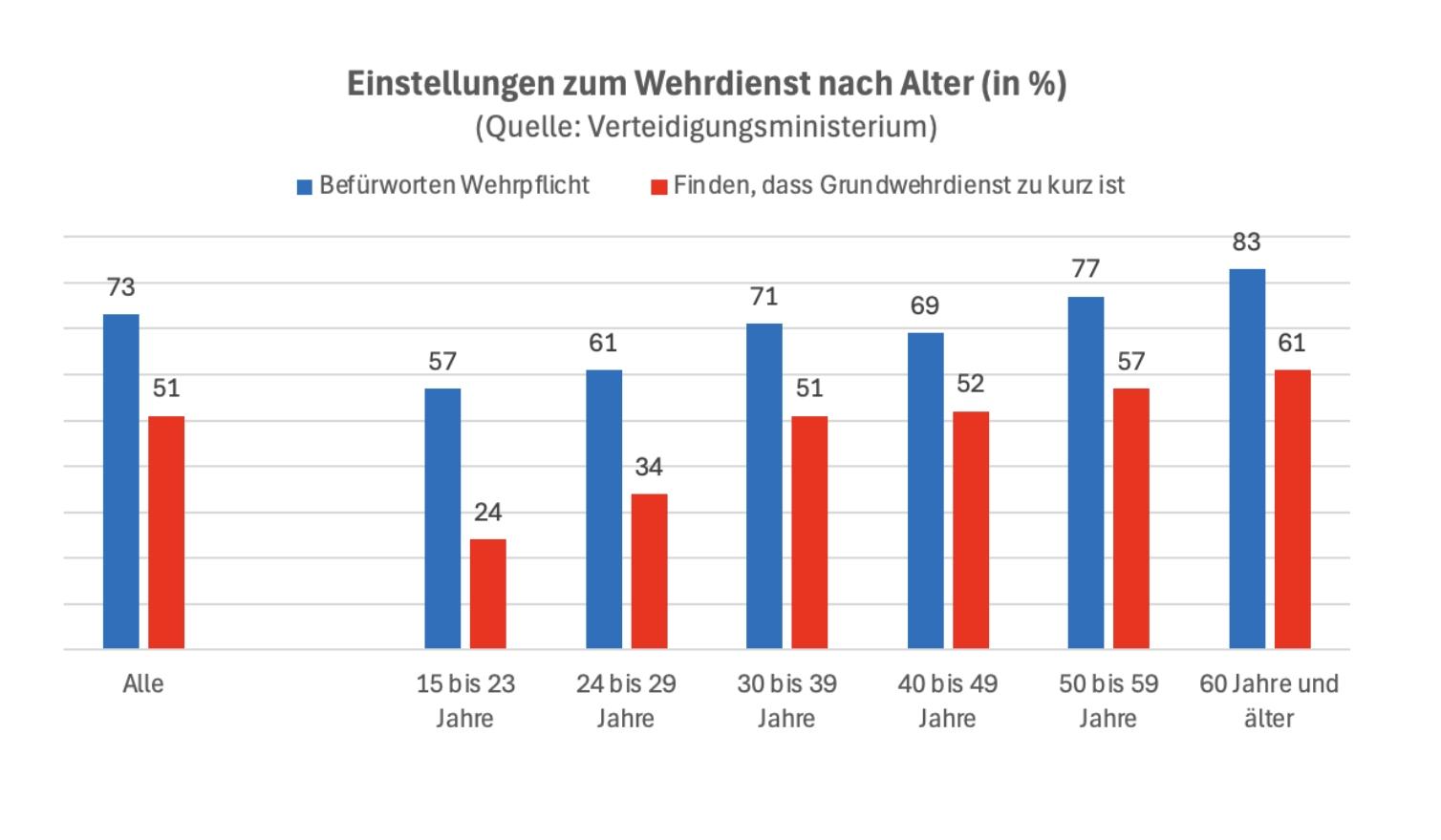 In der österreichischen Bevölkerung ist der Zuspruch zur Wehrpflicht laut einer Erhebung des Verteidigungsministeriums alles in allem sehr groß. 73 Prozent sind dafür. Auffallend ist jedoch, dass es bei Jüngern deutlich weniger sind: Bei 15- bis 23-Jährigen 57 und bei 24- bis 29-Jährigen 61 Prozent. Umgekehrt handelt es sich bei ab 60-Jährigen um ganze 83 Prozent.