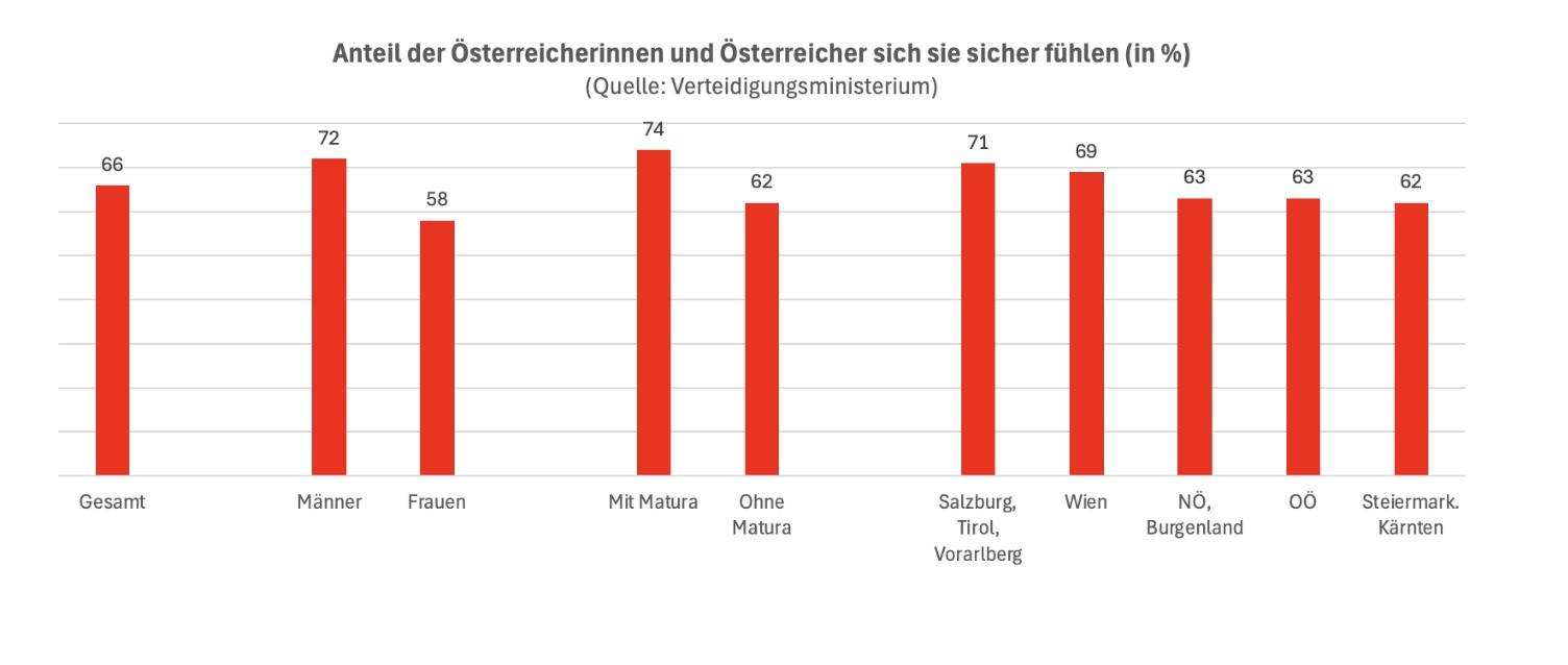 66 Prozent, also zwei Drittel, antworteten mit sehr oder eher sicher. Wobei es große Unterschiede gibt. Zum Beispiel nach Wohnort: Überdurchschnittlich viele Menschen fühlen sich in Westösterreich (71) und in Wien (69 Prozent) sicher. In Niederösterreich und dem Burgenland sowie in Oberösterreich sind es ebenso deutlich weniger (63) wie in der Steiermark und in Kärnten (62 Prozent).
